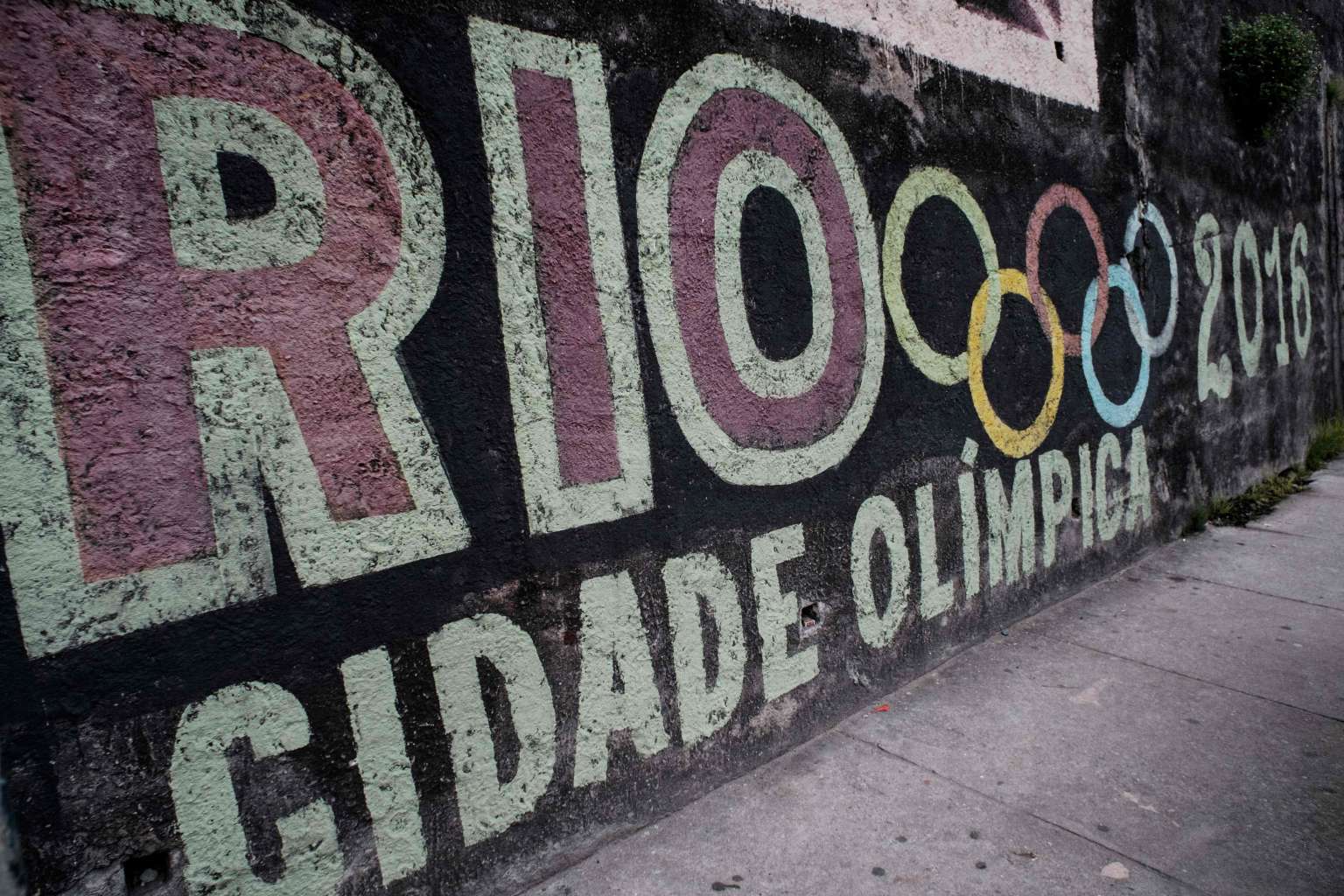 A graffiti with the logo of the Olympic Games on a wall of Rio de Janeiro, Brazil, on June 4, 2016.