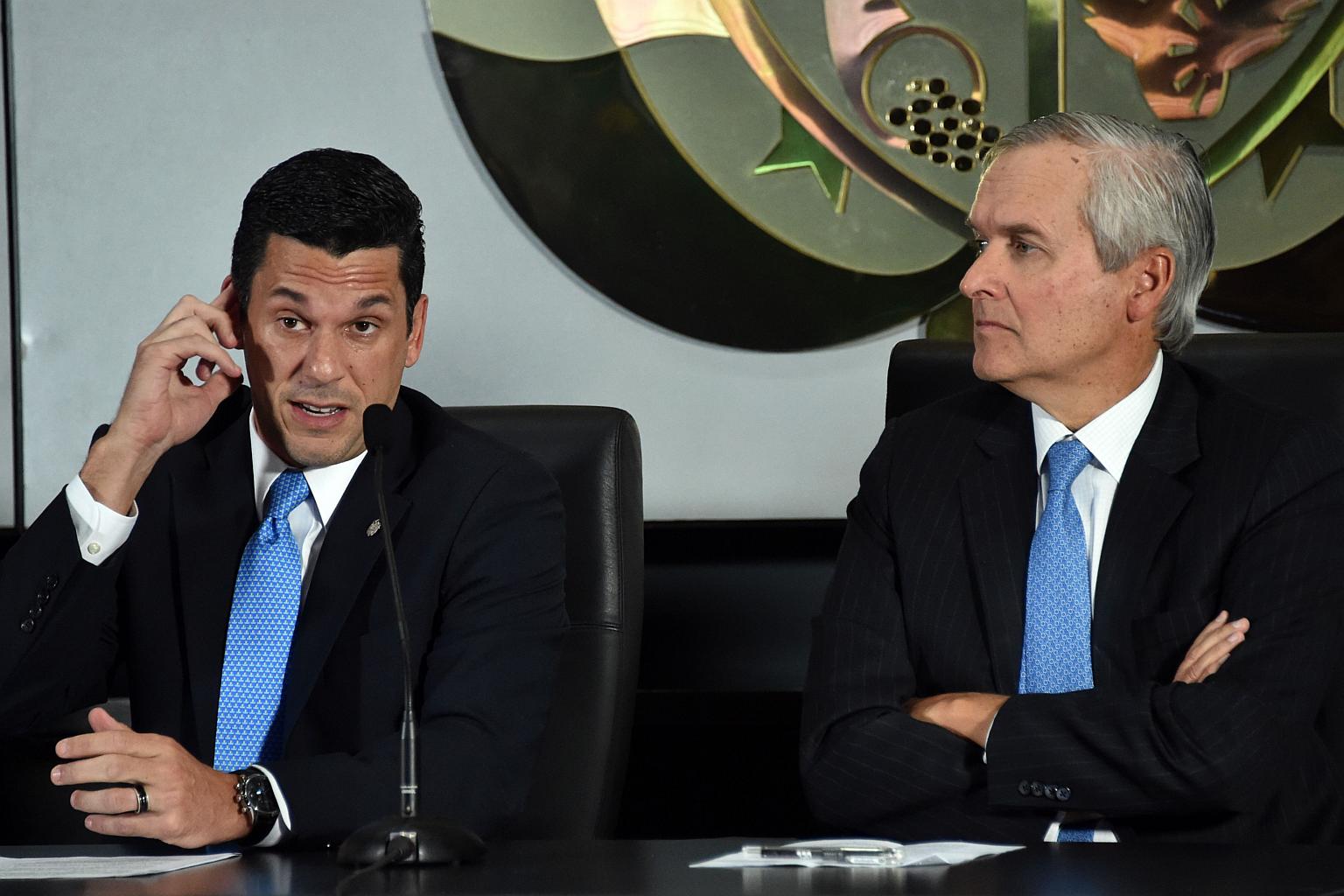 Panama's Minister of the Presidency Alvaro Aleman (right) and Deputy Foreign Minister Luis Miguel Hincapie at a press conference on April 5.