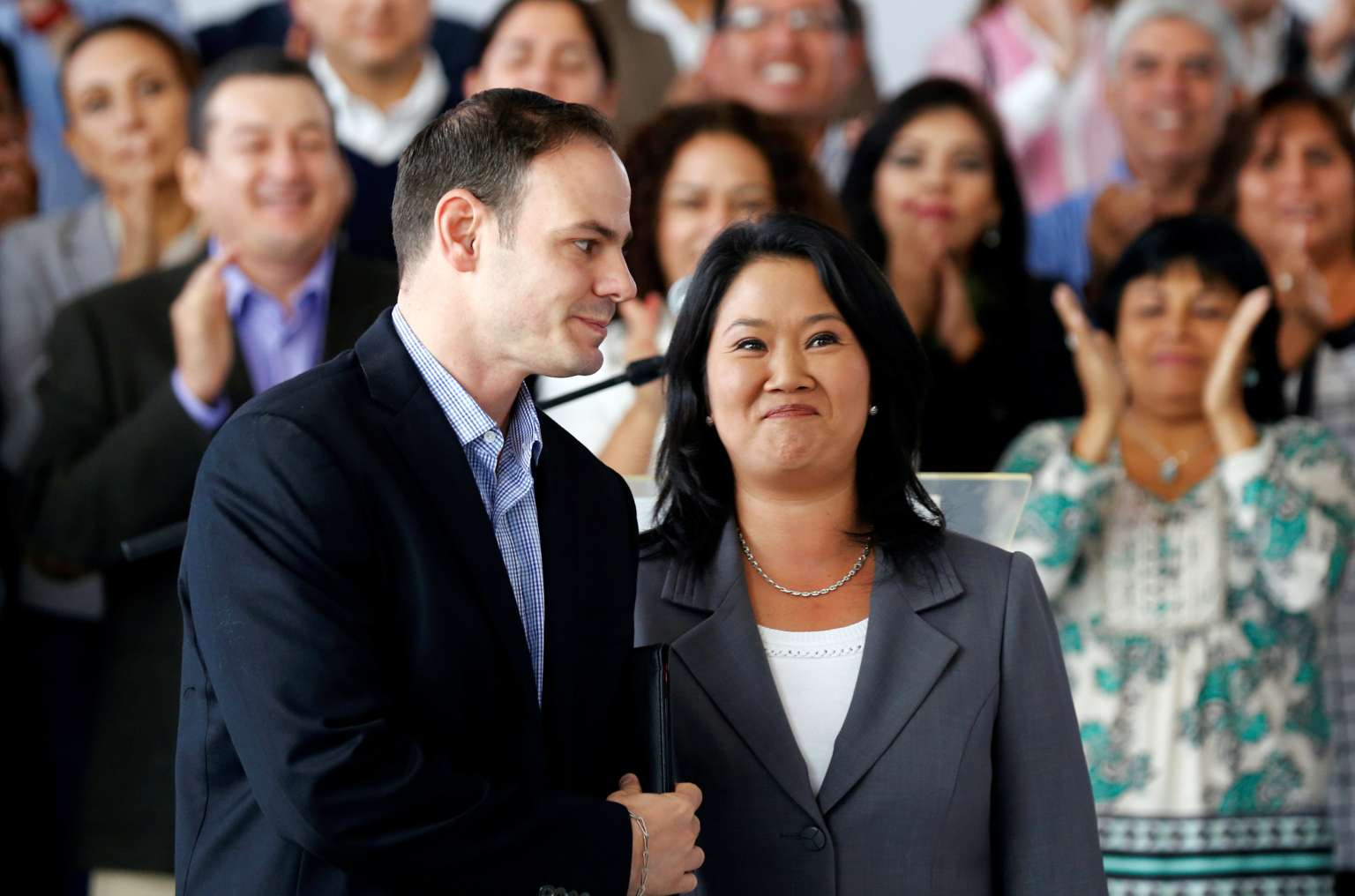 Keiko Fujimori, with husband Mark Villanella, attends a news conference after Peru's electoral office said she lost.