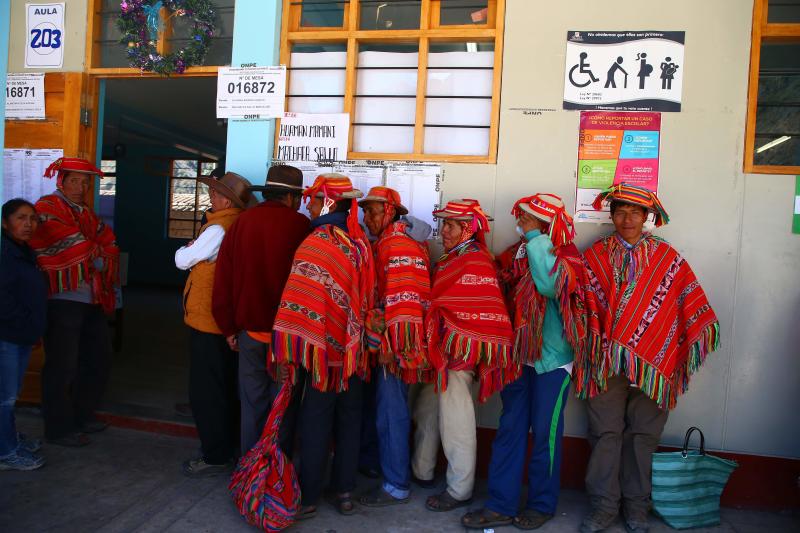 People queue at a polling station in Ollantaytambo, a town located in what is known as the Sacred Valley of the Incas in the province of Urubamba, Cusco region, in southern Peru, as the country votes on Dec 9, 2018.