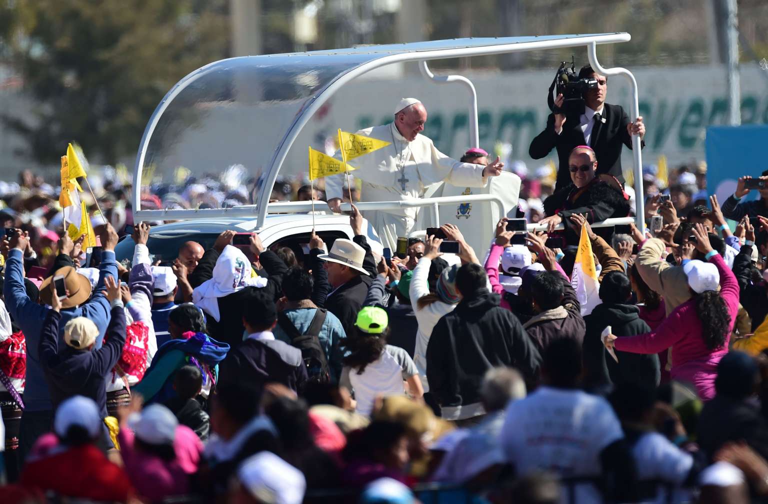 Pope Francis waves from the popemobile upon arrival in San Cristobal de las Casas, in Chiapas, for his second open-air mass, on Feb 15, 2016.