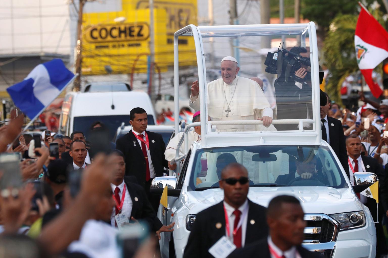 Pope Francis waves from his Popemobile as he arrives for World Youth Day in Panama City on Jan 23, 2019.