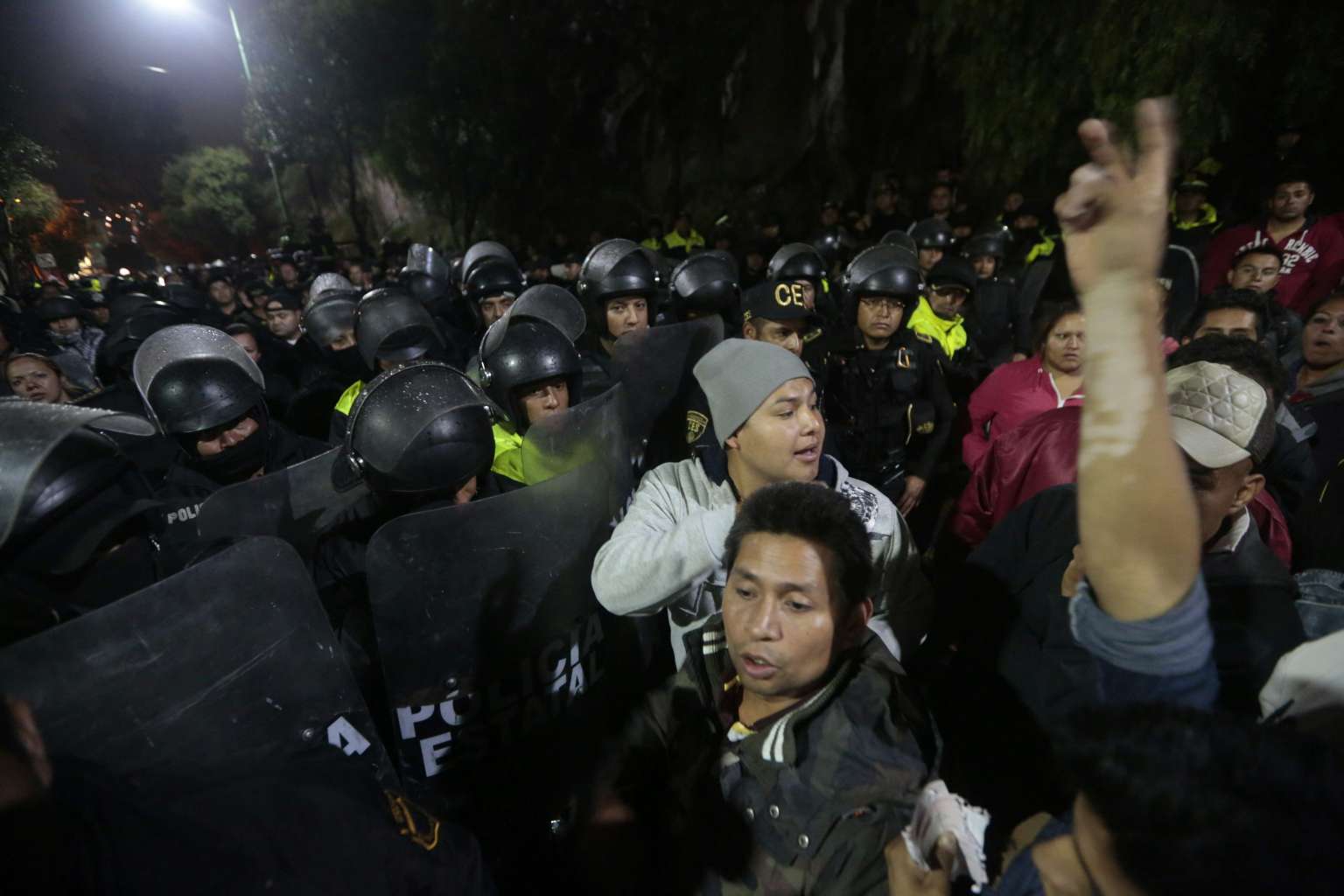 Relatives of prisoners wait for news outside the Barrientos prison as riot police look on, after a riot erupted late on June 13, 2016.