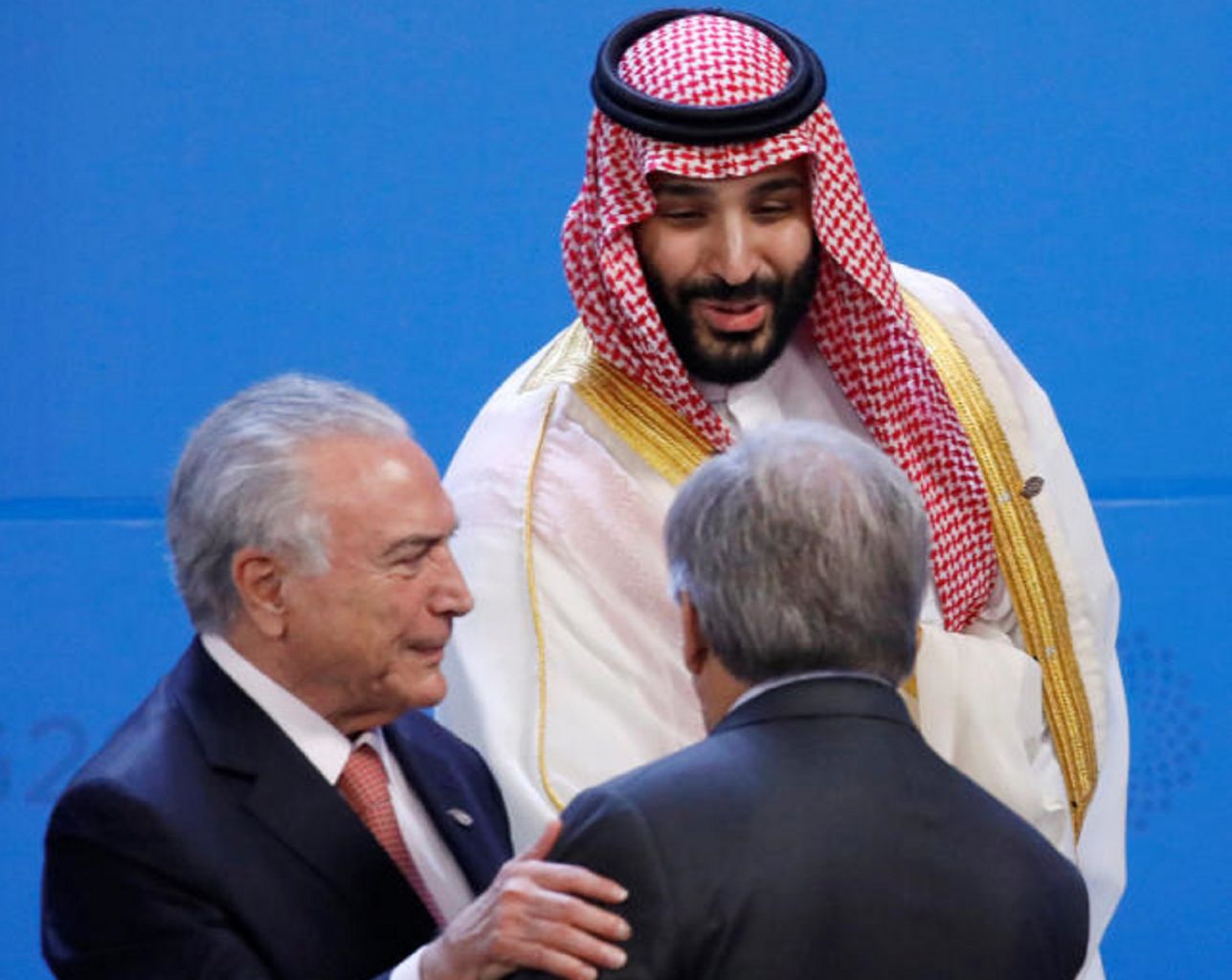 Saudi Arabia's Crown Prince Mohammed bin Salman talks to United Nations Secretary-General Antonio Guterres next to Brazil's President Michel Temer, before the family photo during the G-20 summit in Buenos Aires, Argentina, on Nov 30, 2018.
