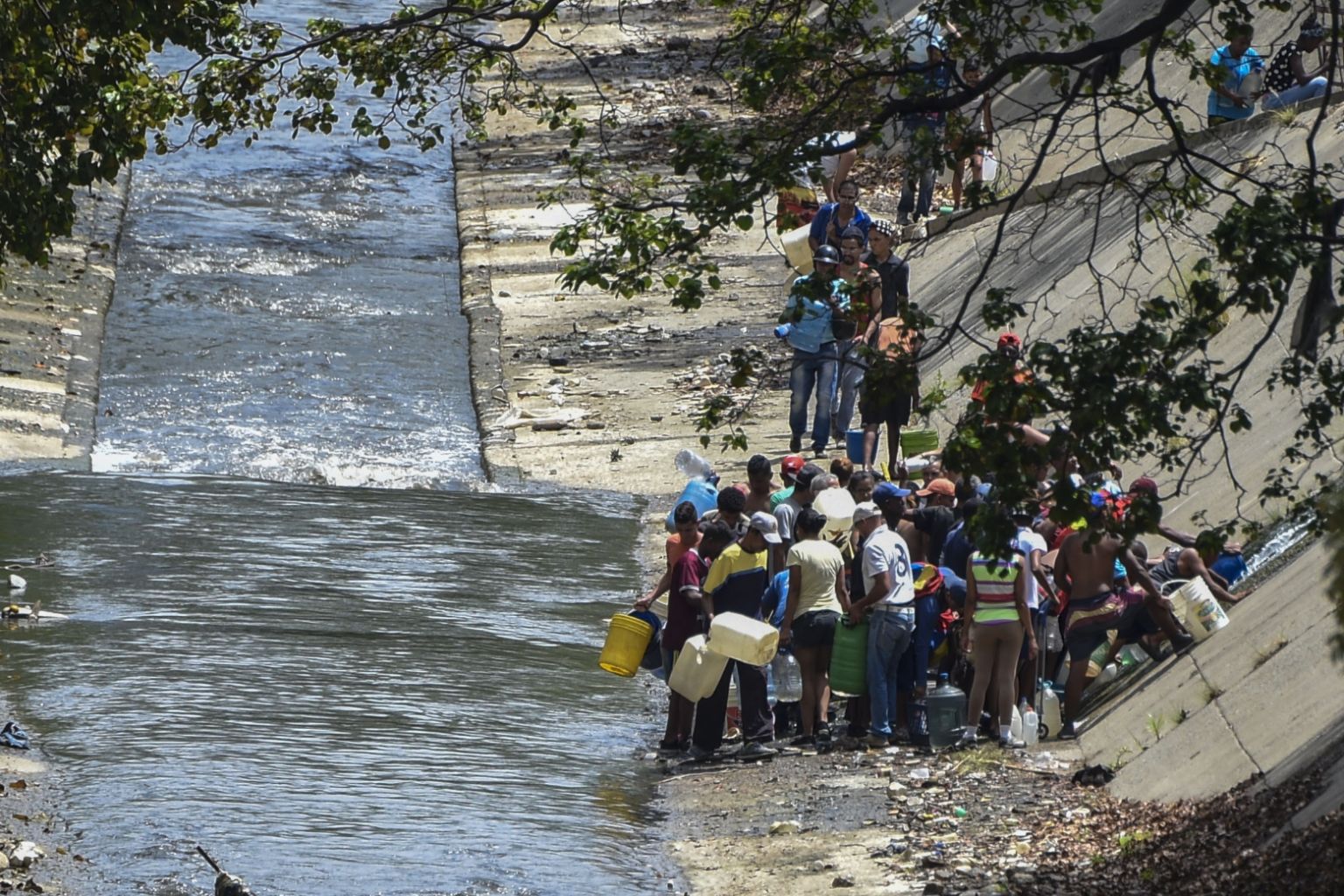 People collecting water from a broken pipe flowing into a sewage canal at the Guaire river in Caracas, on March 11, 2019.