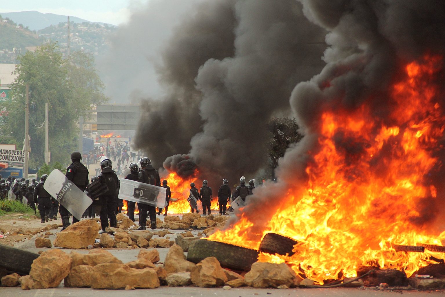 The violence erupted as anti-riot police moved in to dislodge protesters blocking a highway in the southern state of Oaxaca. Television footage showed chaotic scenes of men running from police as gun fire rang out.