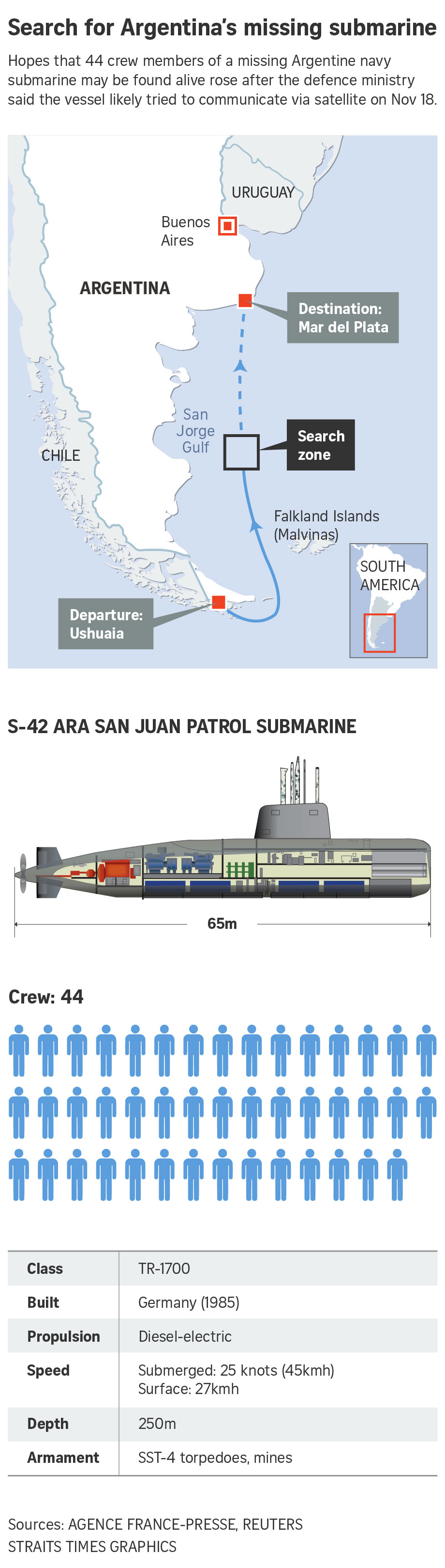 MAR DEL PLATA, Argentina (AFP) - A multinational armada of aircraft and vessels battled high winds and raging seas on Sunday (Nov 19) as they intensified their search for a missing Argentine submarine, after apparent attempted distress calls raised hopes the 44 crew members may still be alive.