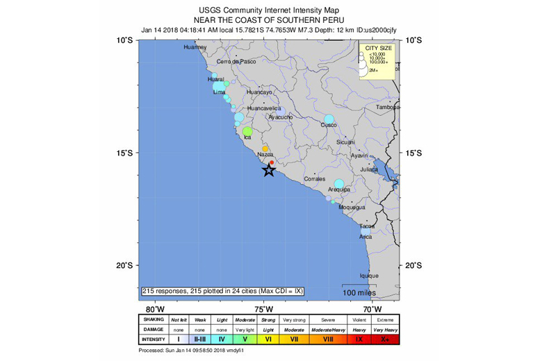 The 7.1 magnitude quake hit at 4.18am local time (0918 GMT) at a depth of around 10km, the USGS said. Peru's government Geophysical Institute said the earthquake was of magnitude 6.7 with its epicenter in Lomas, in the southern region of Arequipa.