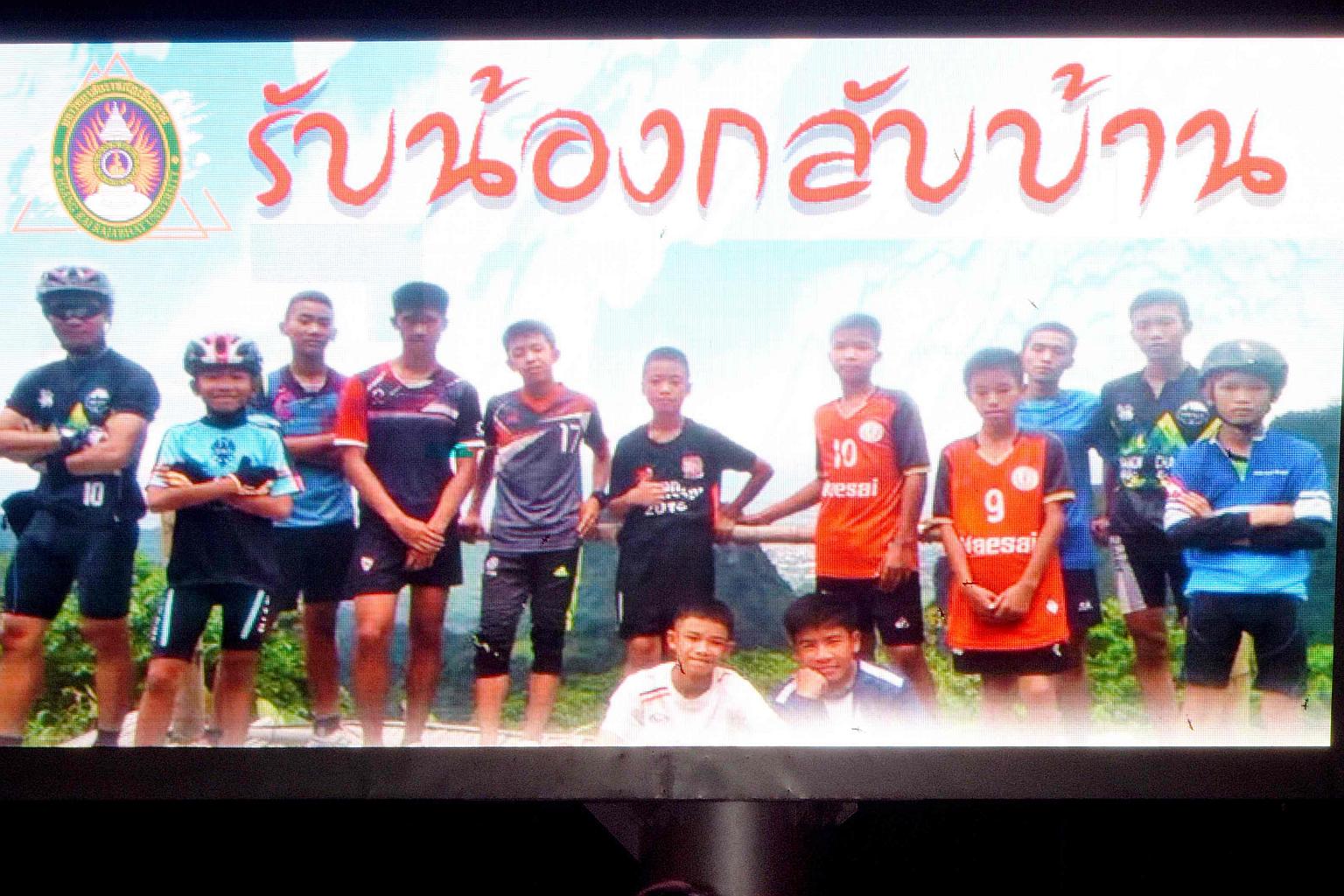 A billboard in Chiang Rai with a photograph showing members of the Thai children's football team and their coach, with a message saying "welcome home, brothers".