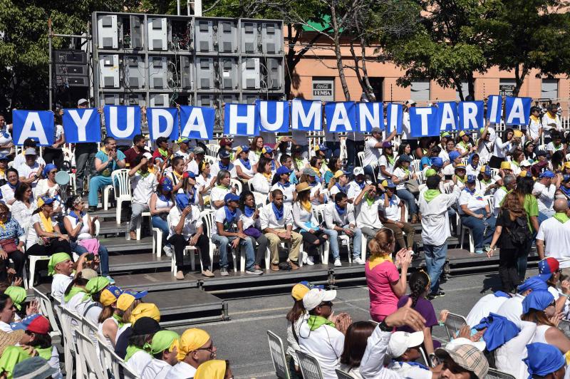 Volunteers of the Aid and Freedom Venezuela Coalition holding up letters forming the words "humanitarian aid" during a rally by Venezuelan opposition leader Juan Guaido in Caracas, on Feb 16, 2019.