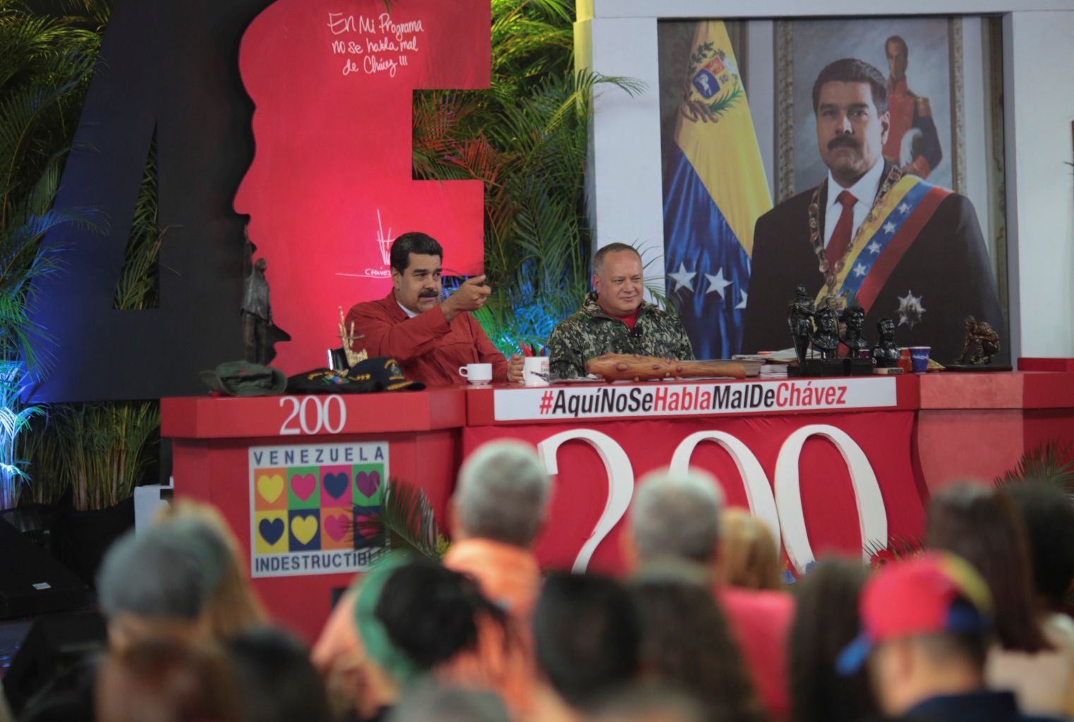 Venezuela's President Nicolas Maduro speaks during a TV show with National Constituent Assembly member Diosdado Cabello in Caracas, Venezuela, on April 11, 2018.