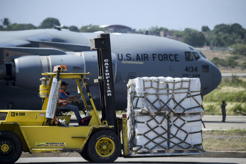 Food and medicine aid for Venezuela is unloaded from a US Air Force C-17 aircraft at Camilo Daza International Airport in Cucuta, Colombia in the border with Venezuela on Feb 16, 2019.
