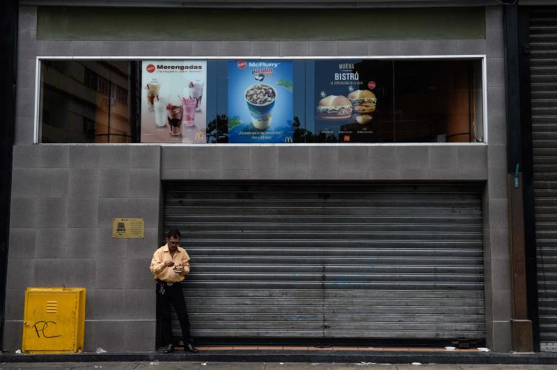 A man eats a dessert next to closed restaurant of the food chain McDonald's, in Caracas on Sept 2, 2018.