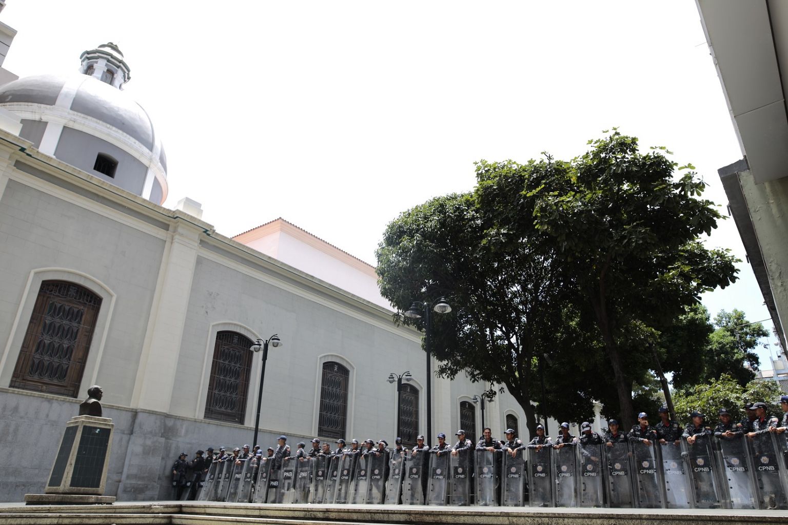 Policemen block the way to the opposition-controlled National Assembly of Venezuela during a search operation for an explosive device inside the building.