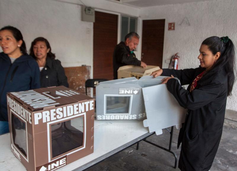 Election staff members preparing ballot boxes ahead of the opening of polls in Mexico City on July 1, 2018.