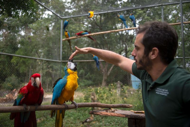 Macaws receive attention from an Ibama worker inside the "flight school" aviary, where the animals try to adapt to life in nature, in Rio de Janeiro, Brazil, on July 18, 2017. Wild animals recovered from illegal trade are treated at the Animal Recovery Centre of Ibama (Brazilian Institute of Environment and Renewable Natural Resources) in the city of Seropedica, about 80km from Rio de Janeiro.