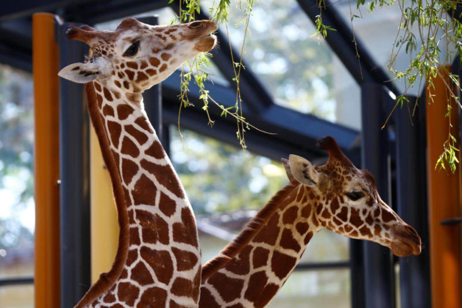 Giraffes Fleur and Sofie stand in their new enclosure in Schoenbrunn zoo in Vienna, Austria, on May 10, 2017.