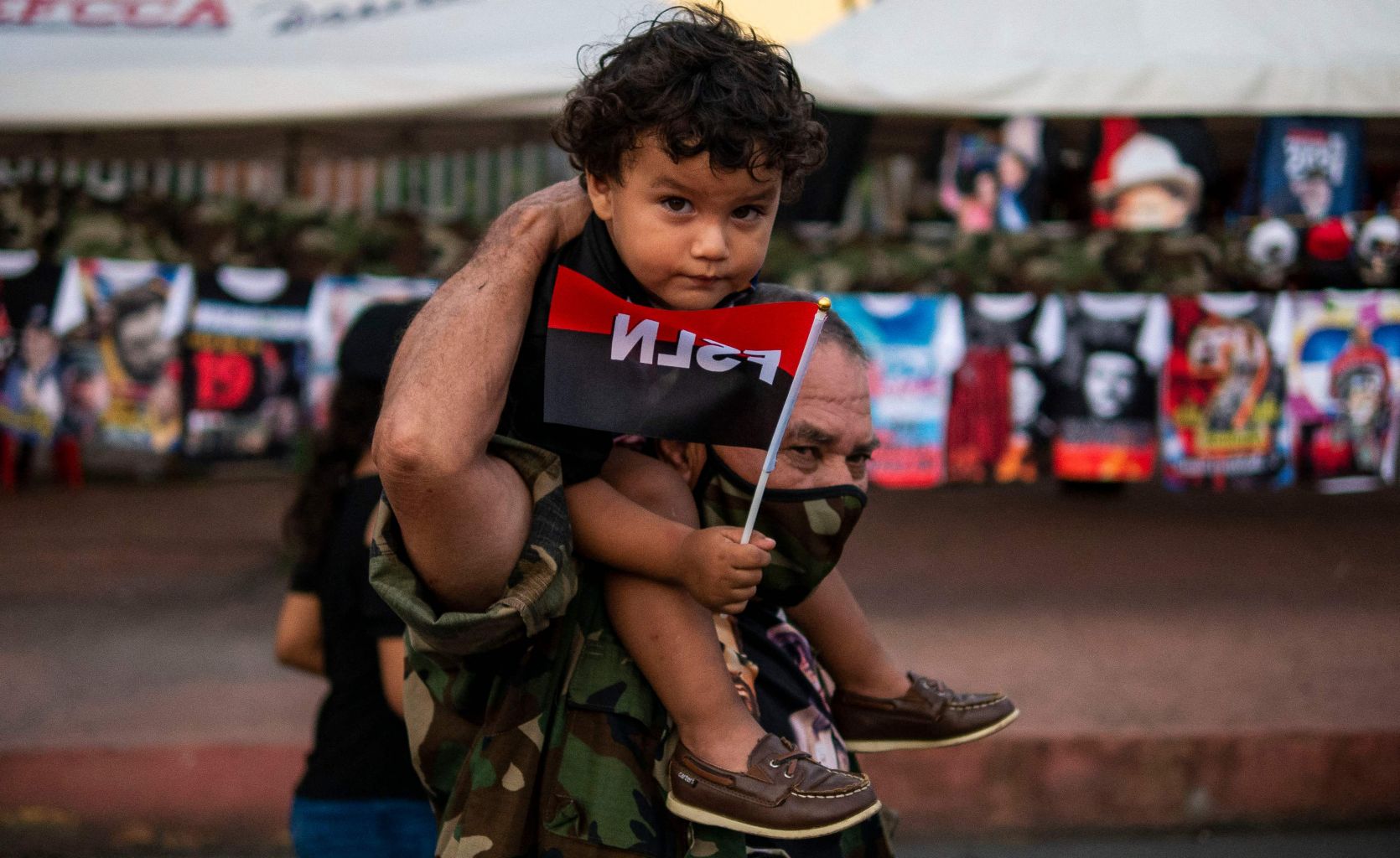 A supporter of Nicaraguan President Daniel Ortega carries a child on his shoulders holding a Sandinista National Liberation Front flag in Managua on July 19, 2021.