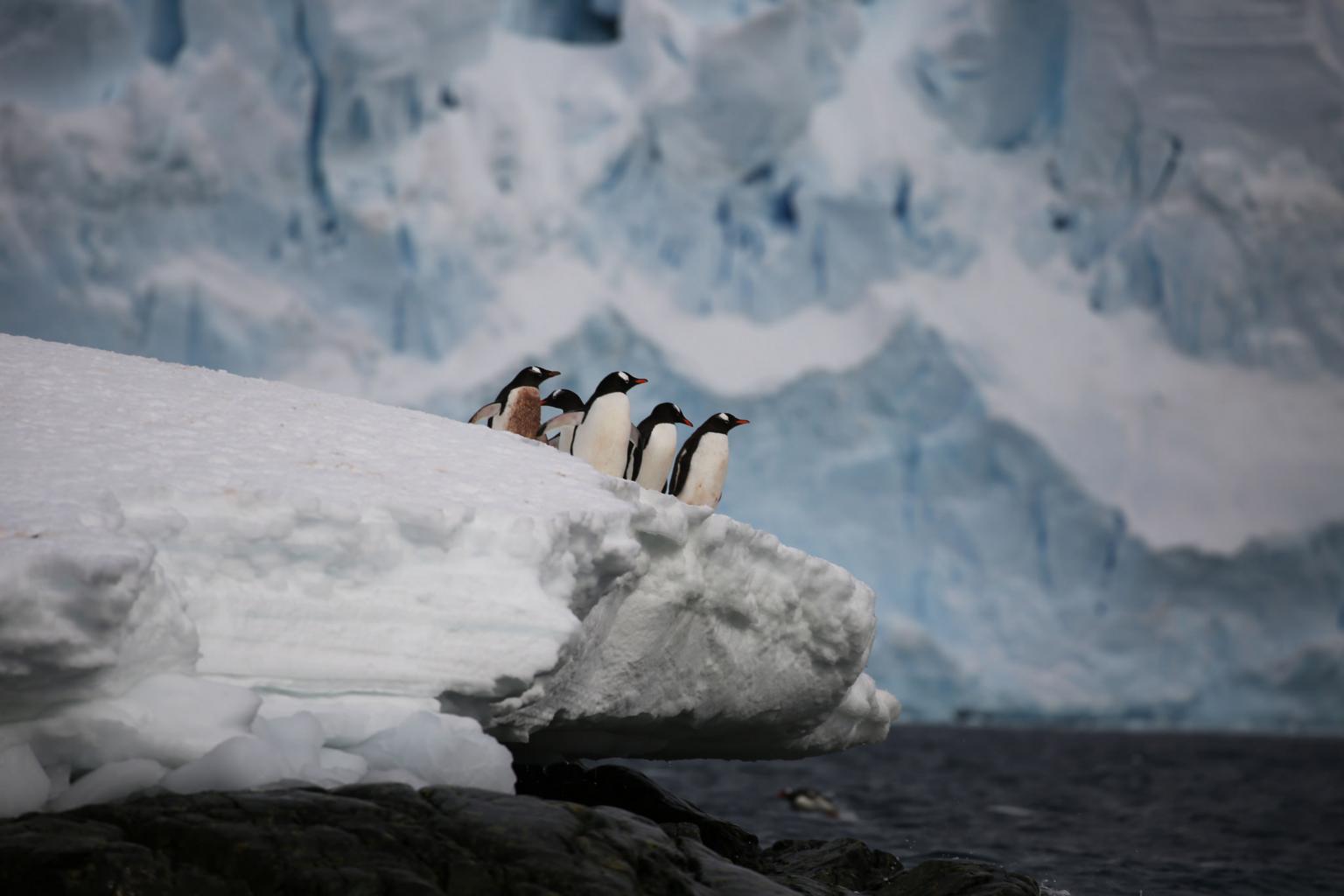 Gentoo pengiuns in Antartica. Antarctica is thawing at an increasing rate because of accelerating discharge from glaciers.