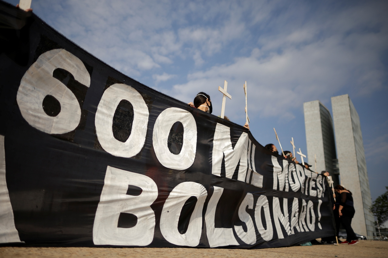 Demonstrators hold a banner and crosses during a protest to pay tribute to Brazil's 600,000 COVID-19 deaths in Brasilia, Brazil on Oct 8, 2021.