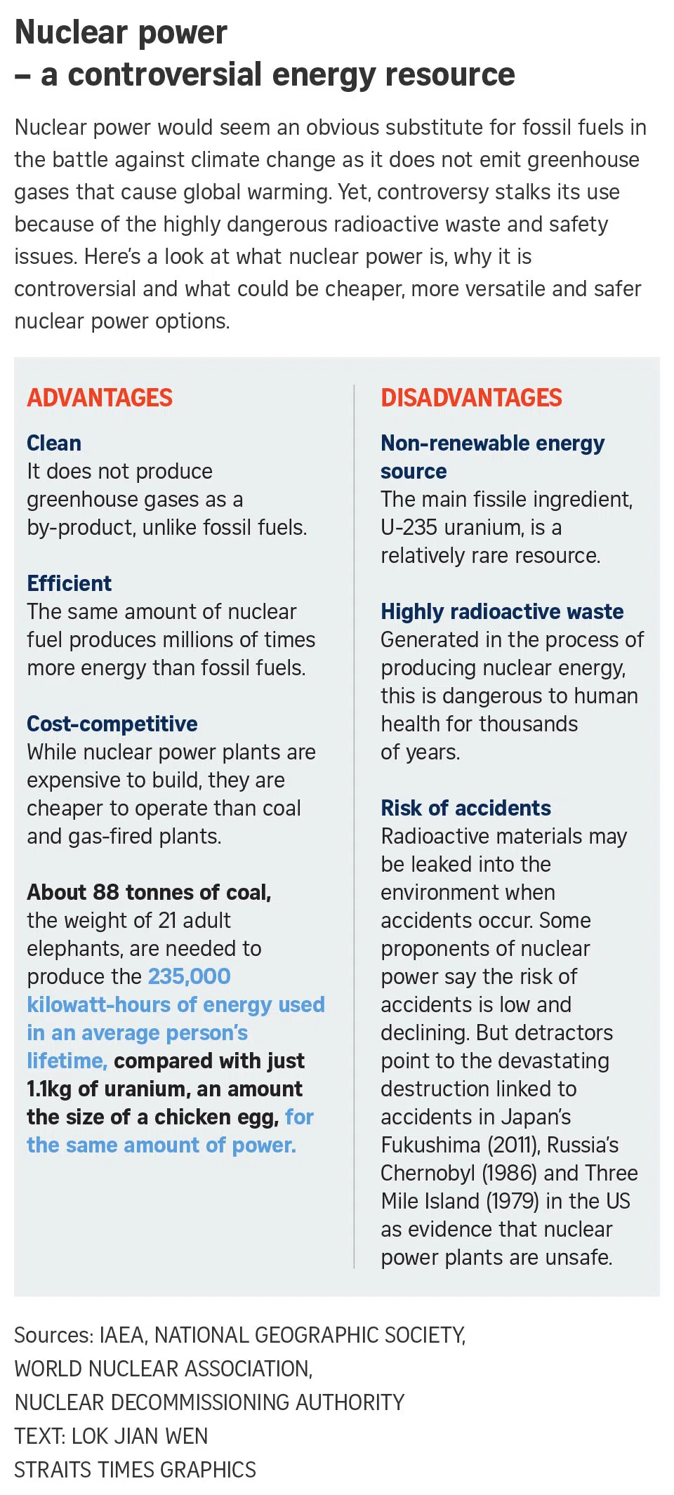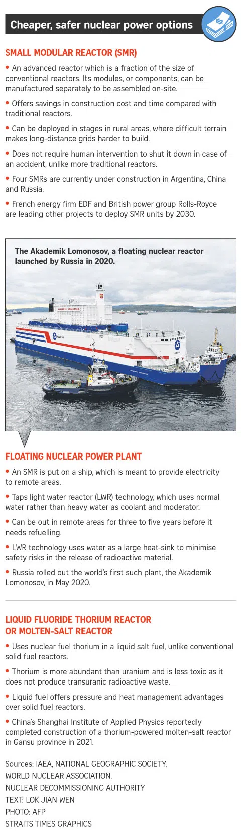 Experts The Straits Times spoke to said nuclear is unlikely to play a role over the next several decades because of costs, time needed to build nuclear power plants and develop the industry around them, and lingering safety fears.