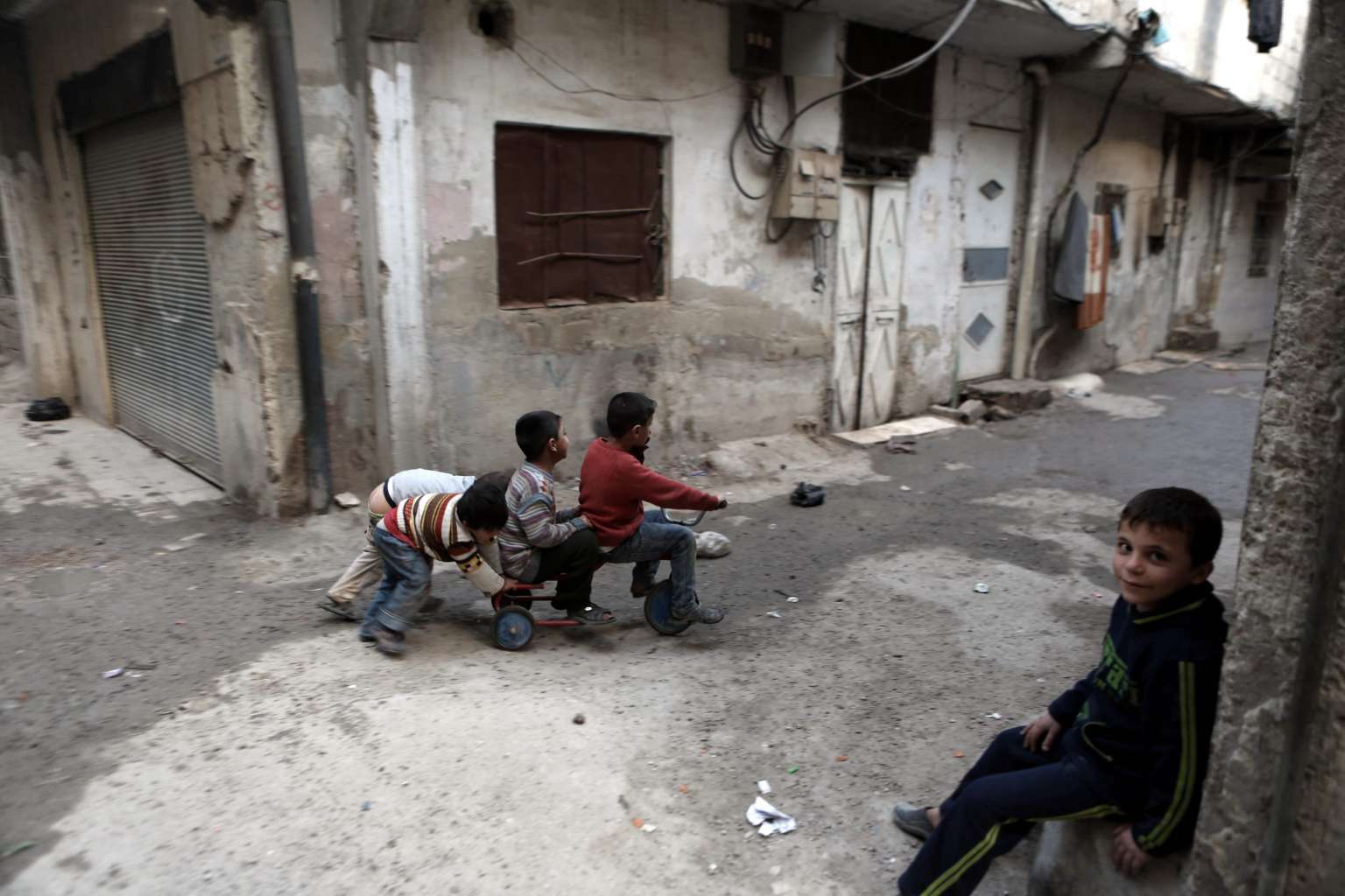 Syrian children play outside their home at the rebel-held neighborhood of Tishreen, after a ceasefire that went into effect in Damascus, Syria, on Feb 27, 2016.