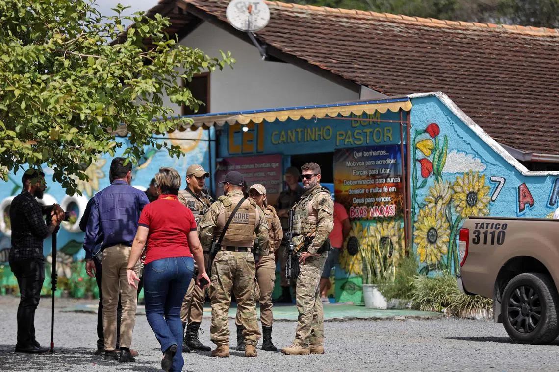 Security forces stand guard outside the private preschool where an attacker killed four children, in Blumenau, southern Brazil.