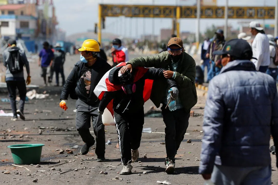 A demonstrator assists an injured man during a clash with security forces near the Juliaca airport in Peru, on Jan 9, 2023.