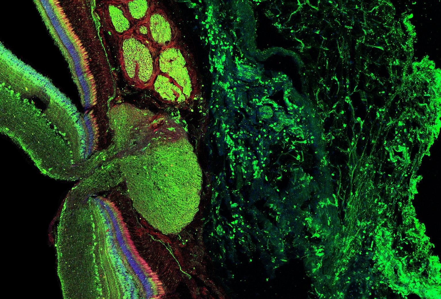 The eye of a rainbow trout, with the retina connected to the optic nerve and surrounded by a bed of capillaries. Seeing is a metabolically expensive process, requiring lots of oxygen usually delivered by red blood cells in the blood flowing through the capillaries. Unlike for the human eyeball, the bed of capillaries in the rainbow trout are found outside of the eyeball. The distance between the capillaries and the retinal tissue can potentially limit oxygen delivery to the eyes of the fish. So how does it get the oxygen it needs to help it see?