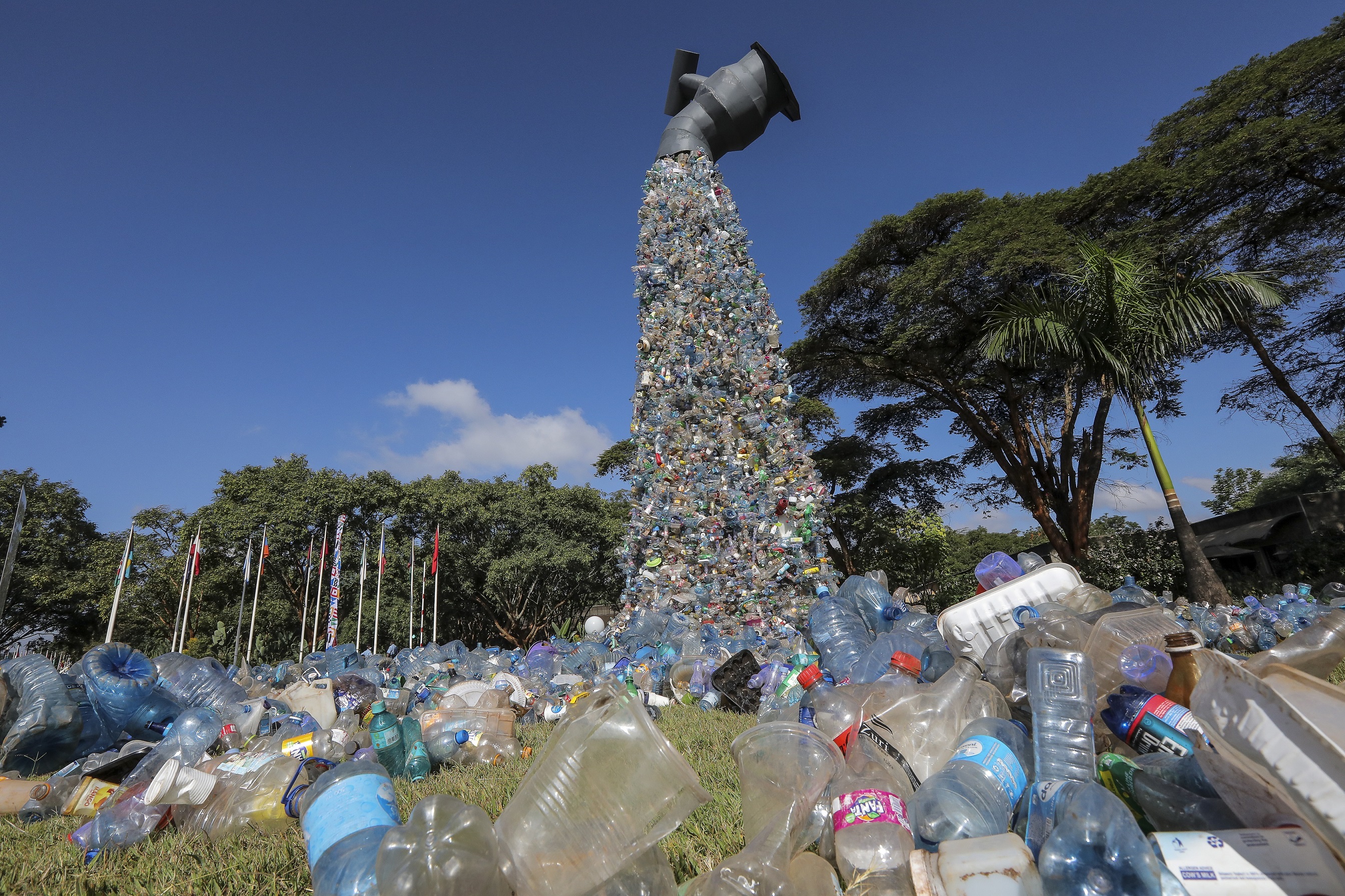 A giant waste plastic artwork by Canadian artist Benjamin von Wong, dubbed "turn off the plastic tap", is seen outside the UNEA meeting venue in Kenya.