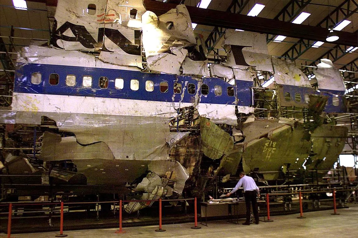 An engineer examining the reconstructed remains of the Pan Am Boeing 747 jumbo jet which crashed into the Scottish village of Lockerbie nearly ten years earlier, on Dec 8, 1998.