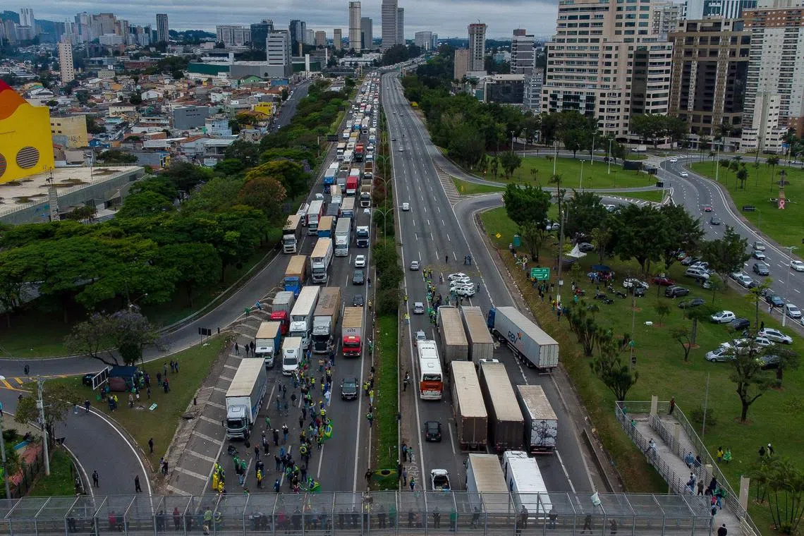 A long line of trucks is seen during a blockade held by supporters of President Jair Bolsonaro in Sao Paulo on Nov 2, 2022.
