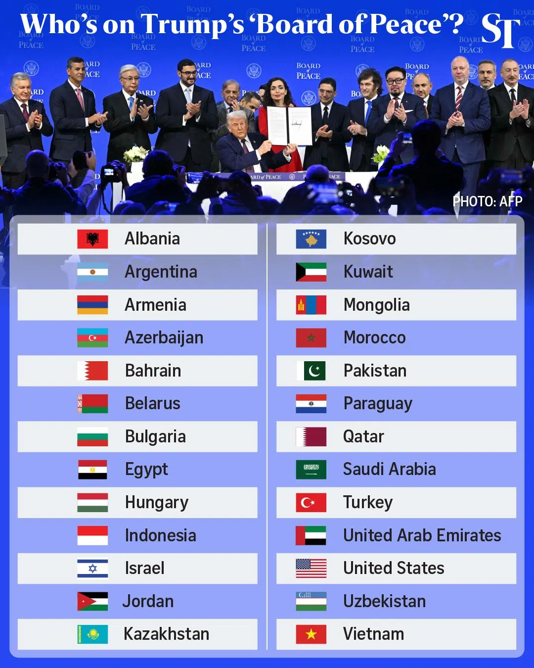 Mr Trump unveiled his Board of Peace at the World Economic Forum in the Swiss ski resort of Davos on Jan 22, joined on stage by leaders and officials from 19 countries to sign its founding charter.