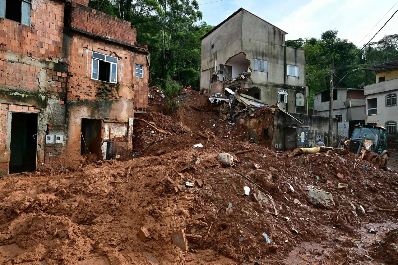 A backhoe loader clears mud and debris after landslides in Juiz de Fora, Minas Gerais state, Brazil, on Feb 26.