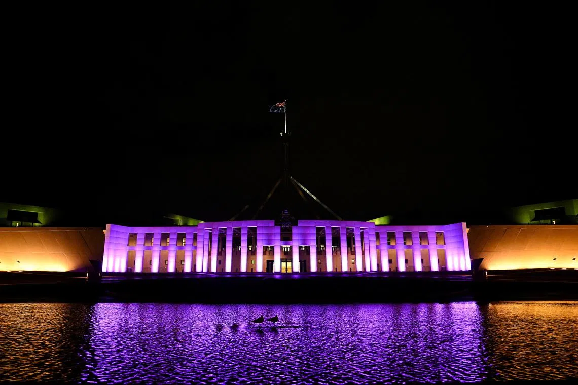 The Australian Parliament in Canberra illuminated in purple to mark the coronation of Britain’s King Charles.