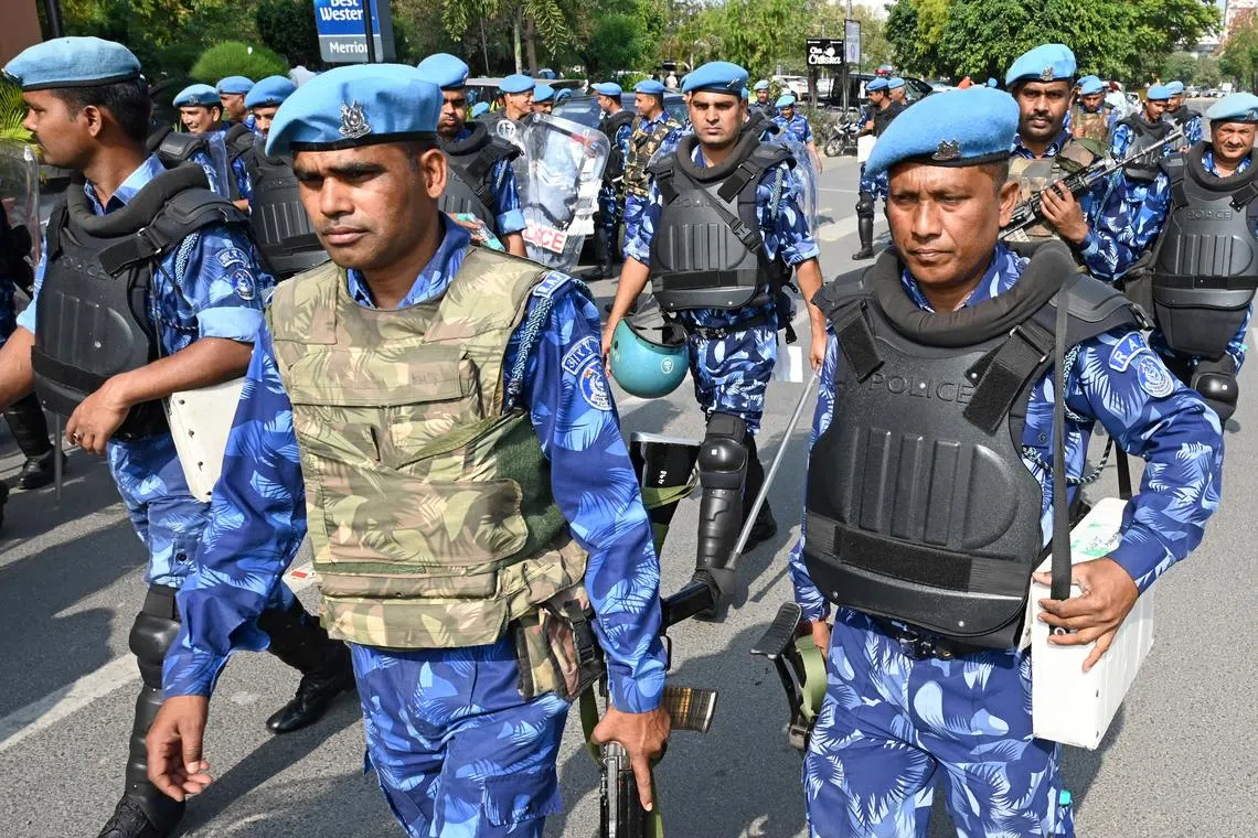 India’s Rapid Action Force personnel patrolling a street during a hunt for Sikh separatists in Amritsar on March 23, 2023.