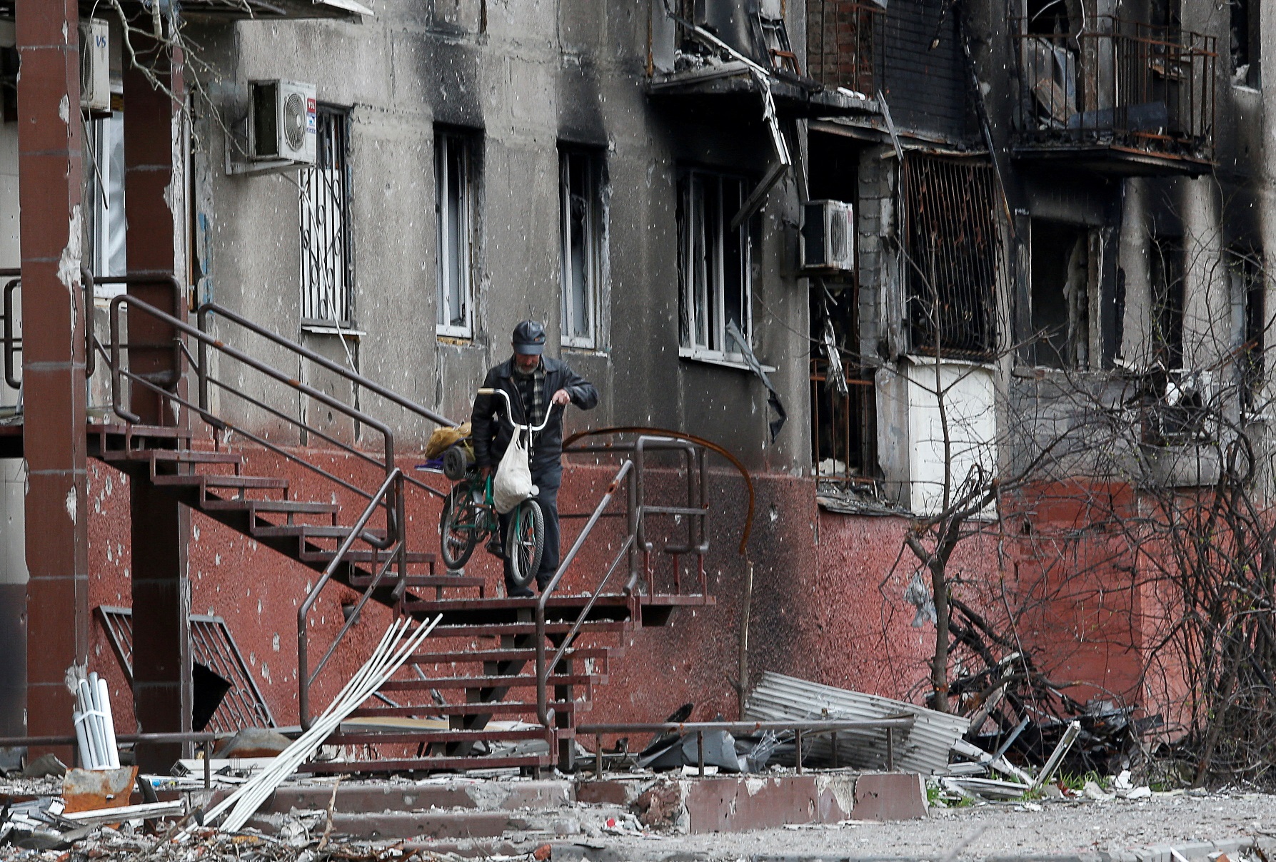 A man walks downstairs outside a residential building damaged by shelling, in the southern port city of Mariupol.