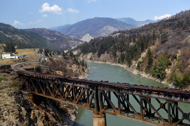 The charred remnants of a rail bridge, destroyed by a wildfire on June 30, 2021.