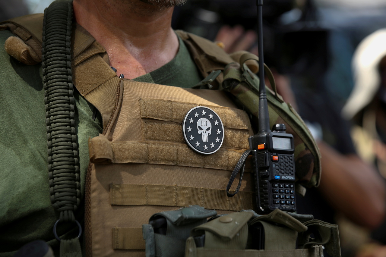 A militia member with a Three Percent militia patch joining a gathering at Stone Mountain, Georgia, on Aug 15, 2020.