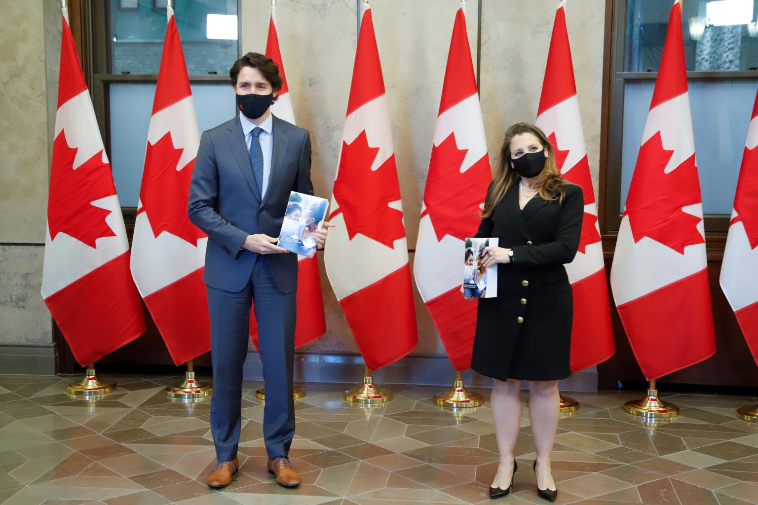 Canada's Prime Minister Justin Trudeau (left) and Finance Minister Chrystia Freeland present the budget on Parliament Hill in Ottawa on April 19, 2021.