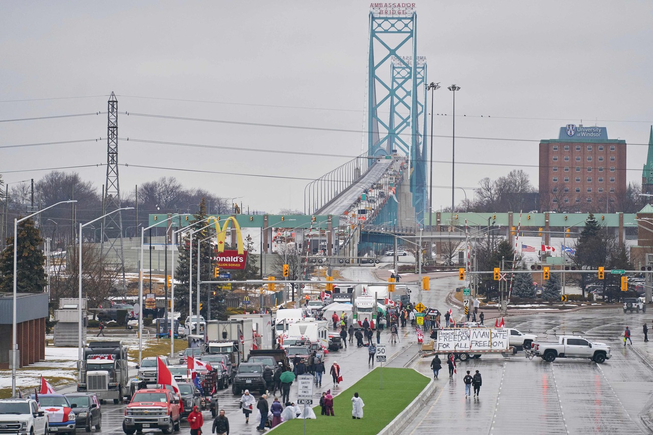 Protesters blocking access to the Ambassador Bridge in Windsor, Ontario, on Feb 11, 2022.