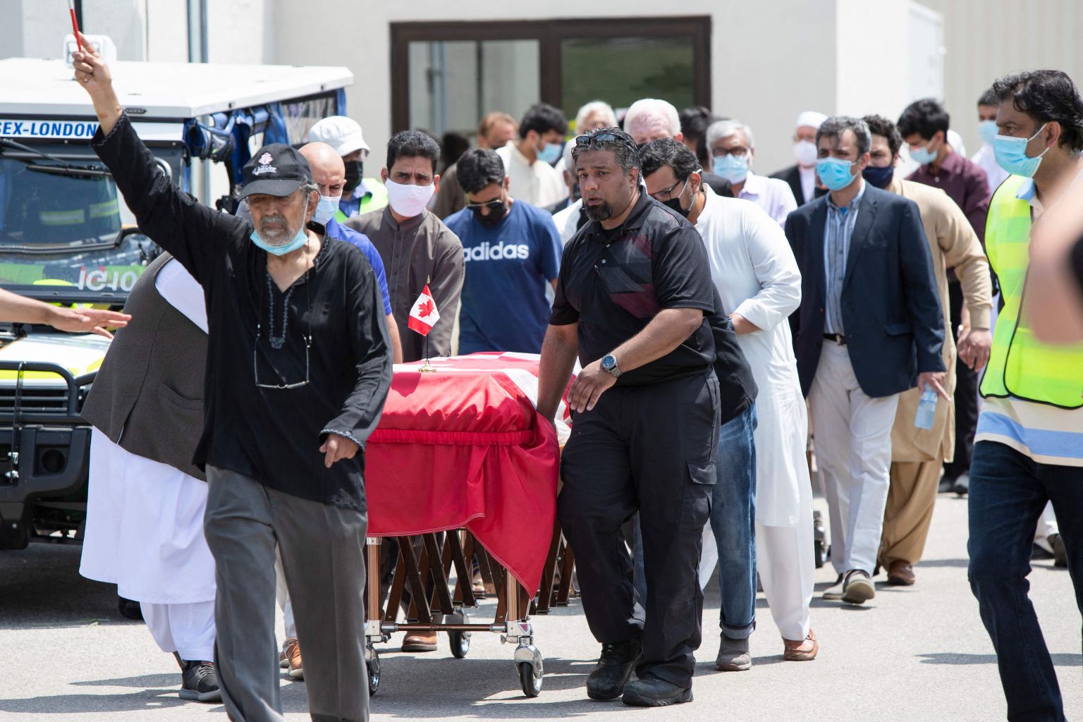 Pallbearers move the caskets of four members of the Afzaal family at the Islamic Centre of Southwest Ontario, on June 12, 2021.