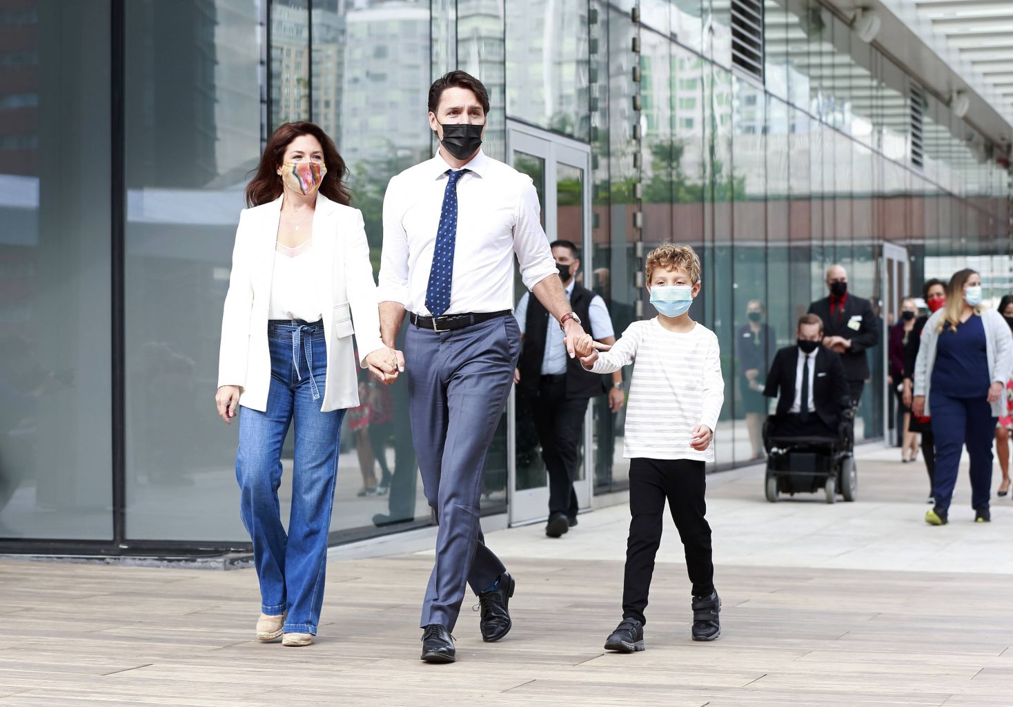 Justin Trudeau walks with his wife Sophie and his son Hadrien during a campaign stop on Sept 13, 2021 in Vancouver.