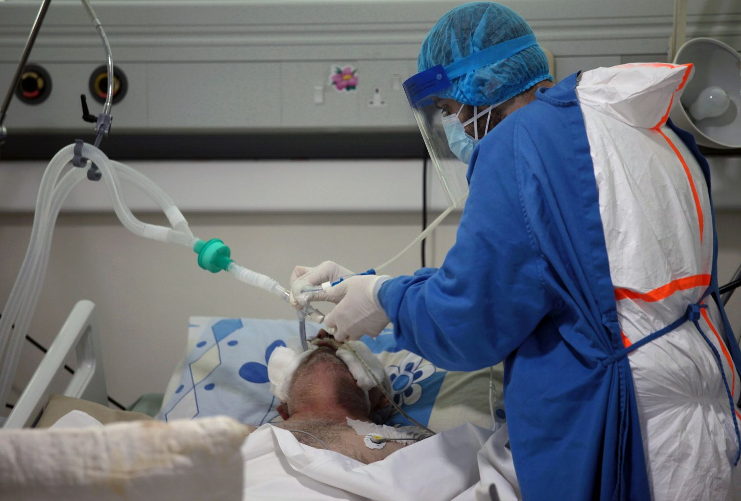 A medical staff member assists a Covid-19 patient at a hospital, in Beirut, Lebanon.