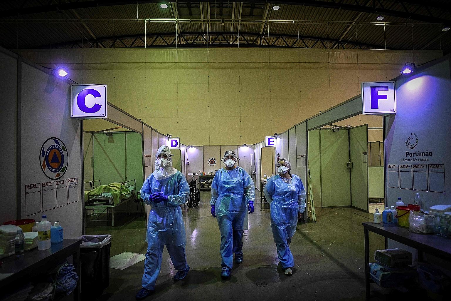 Healthcare workers at a sports pavilion that has been converted into a field hospital for Covid-19 patients in the Portuguese town of Portimao. Researchers at the University of Liverpool have predicted, based on a computer analysis, that the possibility of two different kinds of coronaviruses recombining to produce a new species is more likely than previously thought.