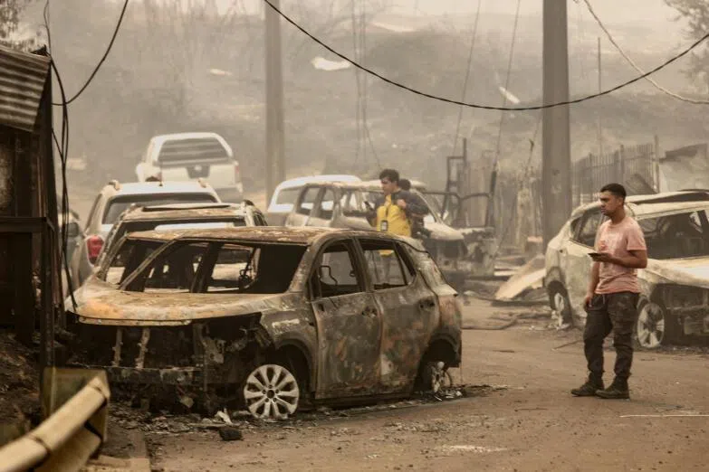 People looked at charred vehicles and damage on a street in the aftermath of a forest fire in the Biobio region, where multiple wildfires prompted emergency evacuations.