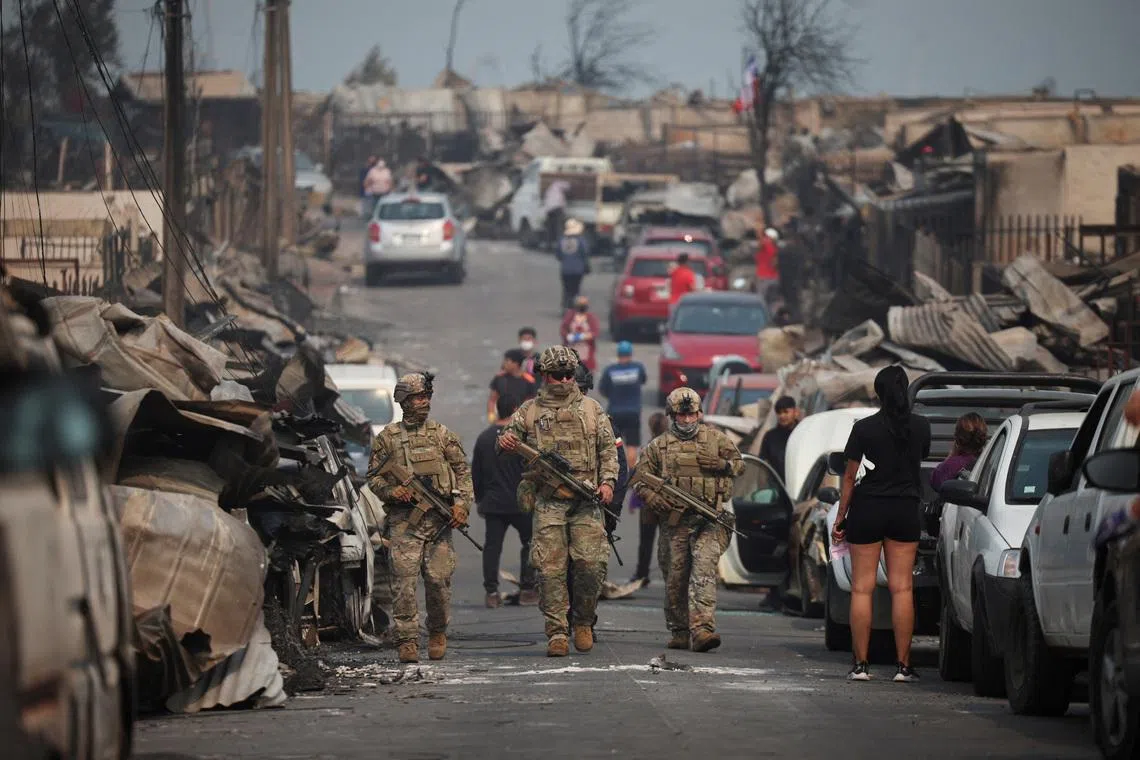 Military personnel walk past destroyed buildings, in the aftermath of a forest fire in the Biobio region, where multiple wildfires prompted emergency evacuations, in Concepcion, Chile.