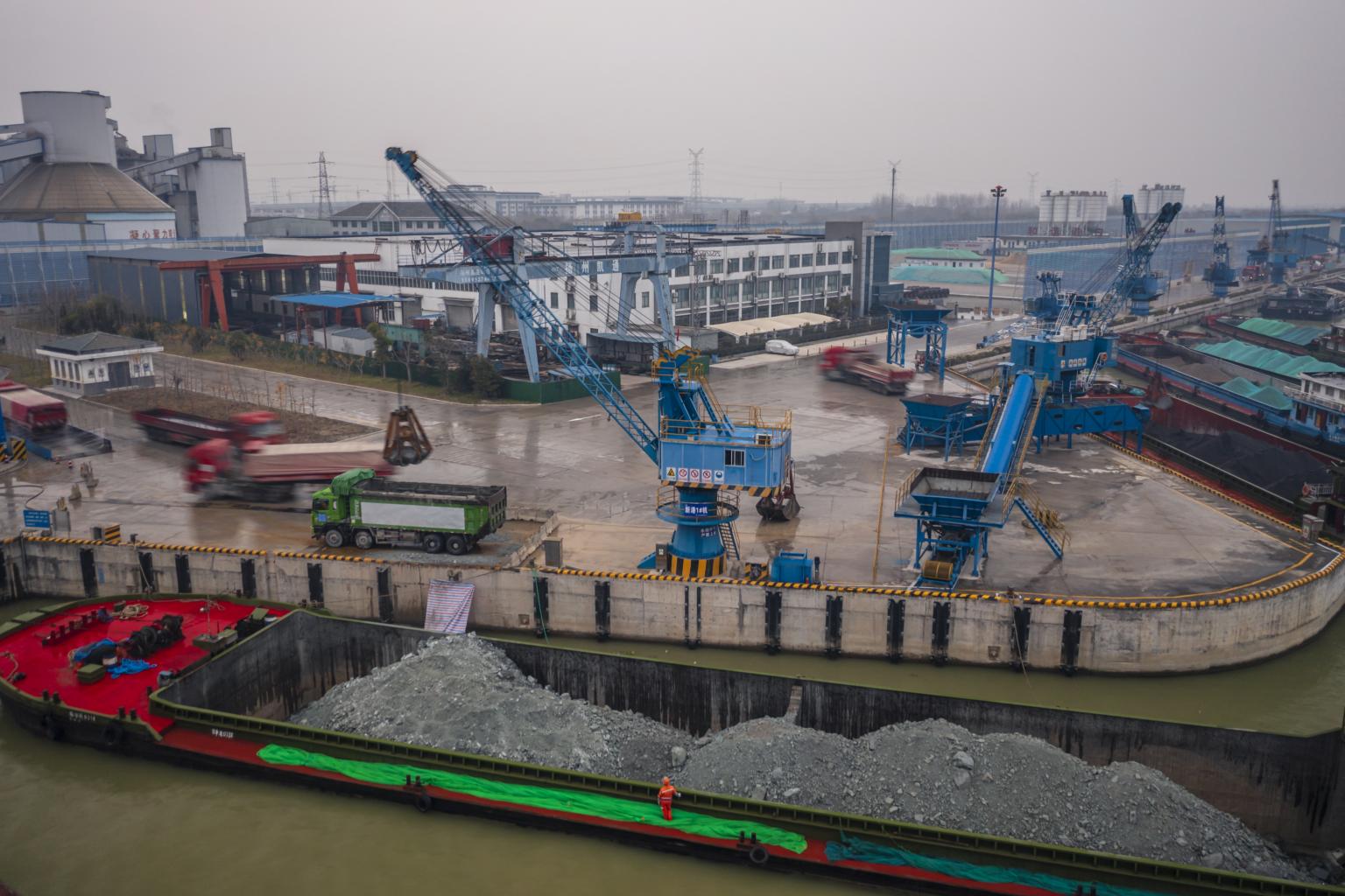 A drone image showing ships transporting coal on the Grand Canal in Yangzhou, Jiangsu province, China, on Dec 9, 2021.