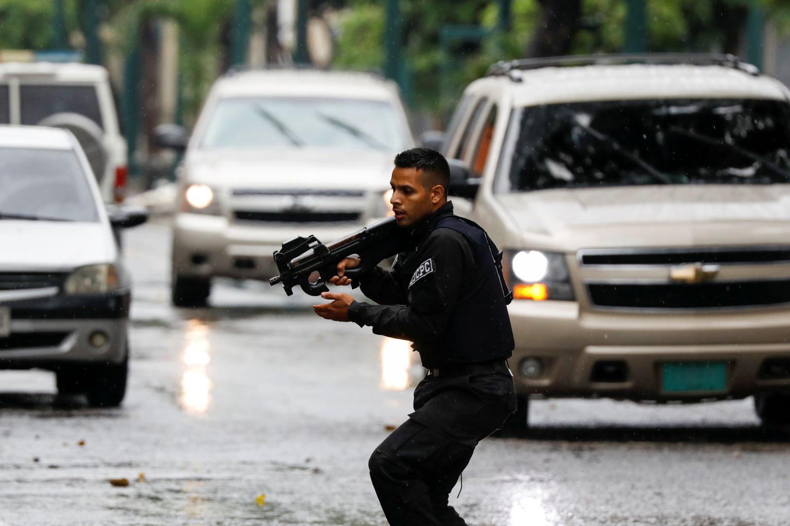 An armed officer takes up a position during an operation to capture members of the Koki criminal gang in Caracas, Venezuela, on July 9, 2021.