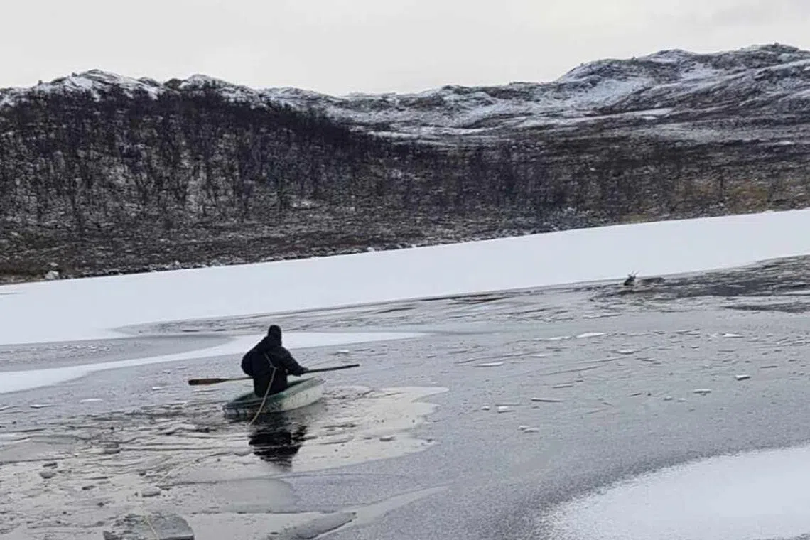 A Sami herder trying to save a reindeer that has fallen through the ice (in background).